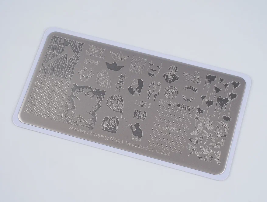 Идея создания пластины пришла талантливому мастеру @nailpud, сочетание шрифтов, текстовых паттернов и эксклюзивных каллиграфий станут отличным самостоятельным дизайном, а также удачно могут служить в качестве дополнительного дизайна с пластиной №102.