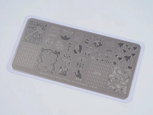 По многочисленным просьбам мастеров мы совместно с By Milky♡Nails @Valeria_nail_stylist подготовили пластину для девушек с дерзинкой. Пластина – вызов, для смелых, заявляющих о себе девушках. Популярный паттерн сетка, надписи изображения девушек, черепа в цветах все арты прекрасно сочетаются между собой создавая каждый раз уникальную композицию на ногтях.